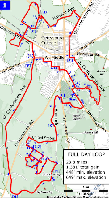 Our 24 mile loop will take 3-4 hours to cover the full battlefield and read the informational signs and use our guidebook. First, we will tour the northern half of the battlefield, including McPherson’s Ridge, Oak Hill, and Barlow’s Knoll. We will then ride through town and stop for snacks (or bring your own). After we refuel, we’ll cover the eastern slopes of Culp’s Hill and GO along Seminary Ridge to explore the southern half of the battlefield, including Little Round Top, Devil’s Den, Rose Woods, and The Peach Orchard, before returning back to Cemetery Ridge.