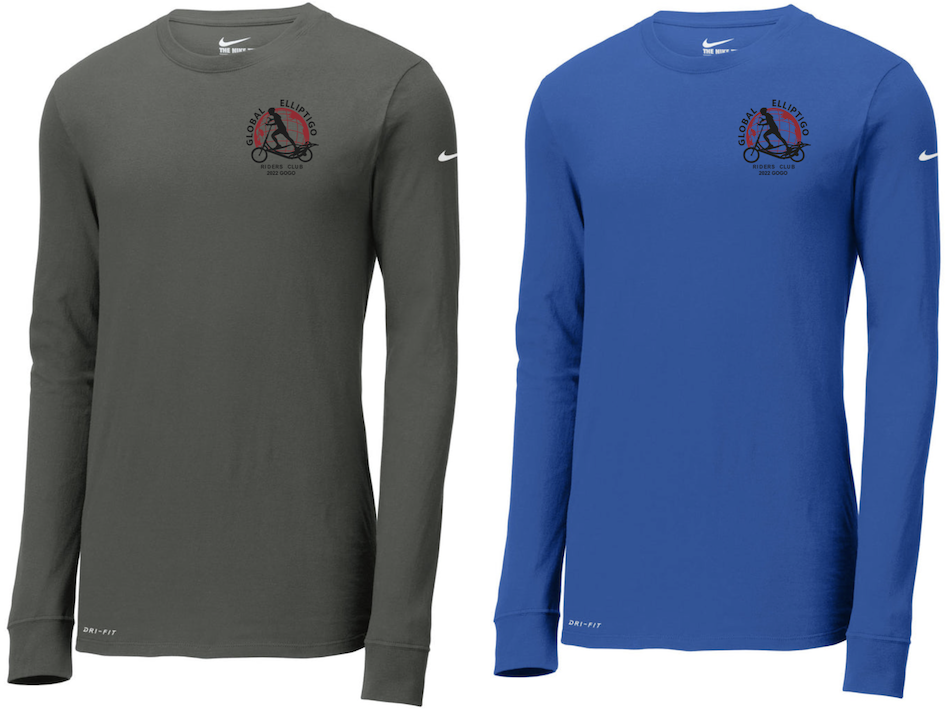 Your choice of gray or blue, this Nike performance long sleeve tee features sweat-wicking fabric to help keep you dry and comfortable on the GO. Notable features include: rib knit crew neck, tag-free comfort, double-needle stitching, and Nike Swoosh design trademark on left sleeve. Made of 4.7-ounce, 60/40 cotton/poly Dri-FIT fabric. The GERC logo and 2022 GOGO are screen-printed in black and red on the upper left of the shirt front.